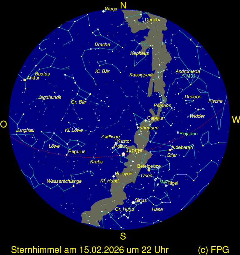 Am 10. Januar kommt Jupiter in Opposition zur Sonne. An diesem Tag stehen Sonne, Erde und Jupiter auf einer Linie. Das führt dazu, dass der Riesenplanet die gesamte Nacht hindurch zu beobachten ist. Zu Neujahr geht der Planet um 17:07 Uhr auf, am Oppositionstag schon um 16:26 Uhr. Nach der Opposition geht Jupiter allerdings immer früher unter. Von 8:29 Uhr am Tag nach der Opposition auf 5 Uhr am 28. Februar und um 4 Uhr MESZ am 31. März.