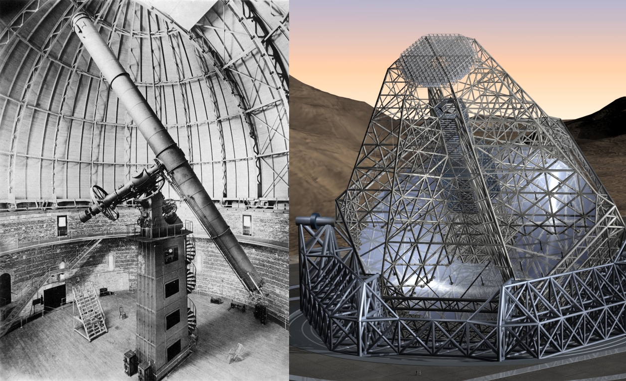 Bild 1 (724 kB): Weiterentwicklung der Teleskope in den letzten 100 Jahren im Vergleich. Links: 1-m-Linsenteleskop (Yerkes-Observatorium, Chicago, USA), rechts: projektiertes europäisches 100-m-Spiegelteleskop ("OWL", ESO).